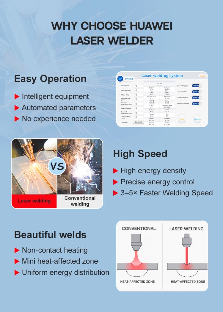 4. পরিচালনা করা এবং শিখতে সহজ: হ্যান্ডহেল্ড লেজার ওয়েল্ডিং অপারেশন সহজ এবং শিখতে সহজ, শ্রম খরচ বাঁচায় এবং দ্রুত প্রশিক্ষণ এবং আনয়নের জন্য উপযুক্ত।
