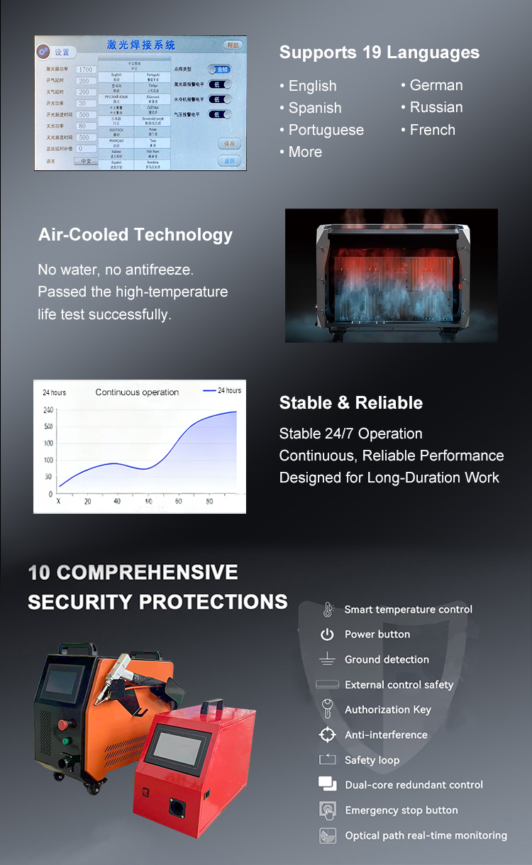 অন-সাইট মেটাল ওয়েল্ডিংয়ের জন্য মোবাইল-রেডি 800W 1200W এয়ার-কুলড হ্যান্ডহেল্ড লেজার ওয়েল্ডিং মেশিনটি সাইটের মেটাল তৈরি এবং মেরামতের কাজের জন্য নমনীয়, দক্ষ এবং নির্ভরযোগ্য ঢালাই প্রদান করার জন্য ডিজাইন করা হয়েছে। এর এয়ার-কুলড ফাইবার লেজার সিস্টেম বাহ্যিক চিলারের প্রয়োজনীয়তা দূর করে, কম রক্ষণাবেক্ষণ এবং সহজ পরিবহনের সাথে স্থিতিশীল কর্মক্ষমতা নিশ্চিত করে। লাইটওয়েট, কমপ্যাক্ট এবং আর্গোনোমিকভাবে ডিজাইন করা, এই হ্যান্ডহেল্ড ওয়েল্ডারটি মসৃণ ওয়েল্ড সিম, ন্যূনতম তাপ বিকৃতি এবং স্টেইনলেস স্টীল, কার্বন স্টিল, অ্যালুমিনিয়াম এবং অন্যান্য পাতলা ধাতুতে সামঞ্জস্যপূর্ণ ফলাফল সরবরাহ করে, এটি মোবাইল ওয়েল্ডিং, ফিল্ড রক্ষণাবেক্ষণ এবং ছোট থেকে মেটাল ওয়ার্কশপের জন্য একটি আদর্শ সমাধান করে তোলে।